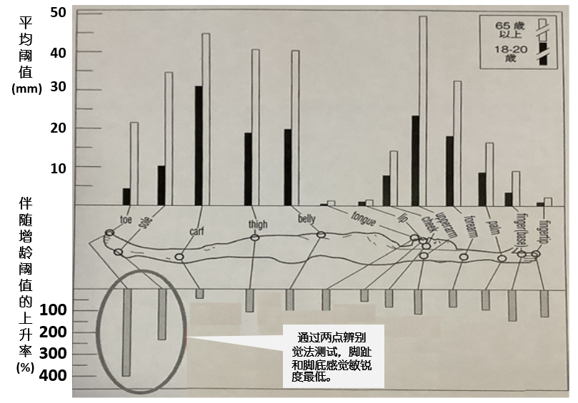 图片-3是日本研究人员通过两点辨别觉法对身体各个部位的触觉神经老化进行了研究。其中一个研究结果是,身体触感敏感度的排名是1。手掌和指尖 嘴唇、鼻子和面部周围3.脚趾(toe)和脚底(sole)。其次,老年人(65岁以上)身体各部位的触感阀值明显高于年轻人(18-20岁)(图表上方:均值阀值)。同时,虽然脚趾和脚底触觉神经的触觉敏感度排名第三,但“由于年龄增加而引起的触觉神经缓慢程度”最为显著(图下:随着年龄增加的阀值增加)。需要注意的是,脚趾和脚底是感知身体不平衡的最早、最敏感的部位,由于年龄增加而引起的触觉神经迟缓无疑是老年人容易摔倒的最重要原因之一。