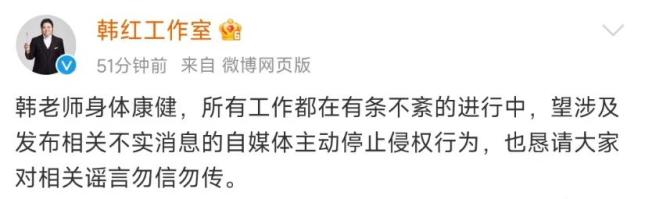 接着,@韩红工作室 转发此微博,并配文:韩老师身体健康,各种工作都在有条不紊地进行着。