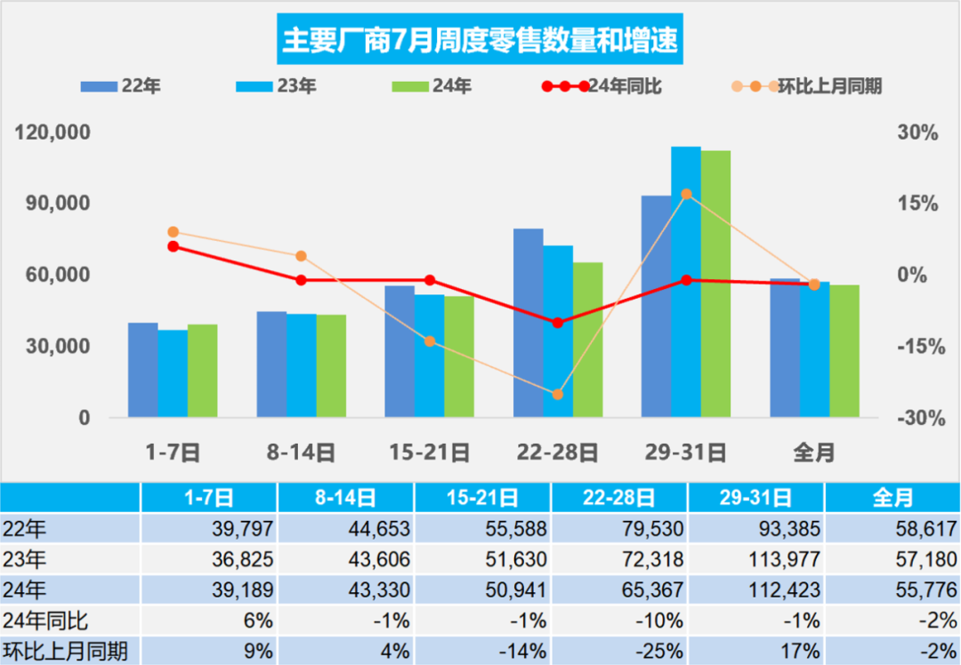 根据协会的数据,7月第一周(7月1日至7月7日),国内乘用车市场日均零售额约为3.9万辆,同比增长6%,同比增长9%。;第二周(7月8日至7月14日),国内乘用车市场日均零售额约为43000辆,同比下降1%,同比增长4%。;三周(7月15日至7月21日),与上月同期相比,国内乘用车市场日均零售额约为5.1万辆,同比下降1%,同期下降14%。;第四周(7月22日至7月28日),国内乘用车市场日均零售额约为65,000辆,同比下降10%,同比下降25%。;七月五日(七月二十九日至七月三十一日),国内乘用车市场平均零售额约为11.2万辆,同比下降1%,比上个月同期增长17%。