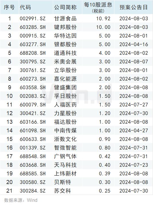 Wind 统计数据显示,截至 8 月 7 日,A 已有甘源食品、键邦股份等股份 21 家庭上市公司推出中期现金分红计划。