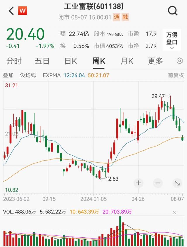 股票价格方面,截至 8 月 7 每天收盘,工业富联收盘。 20.4 元 / 股票,年内涨幅高达 总市值超过42.46% 4000 亿。