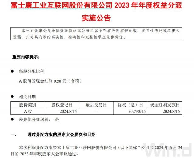 8 月 7 日晚间,实施工业富联公告 2023 年度分红计划,每个 10 股派现 5.8 人民币,分红总额为 115.2 自上市以来,分红率达到新高。 54.77%。本次股权分配登记日为 8 月 14 每天,除权除息日为 8 月 15 日。