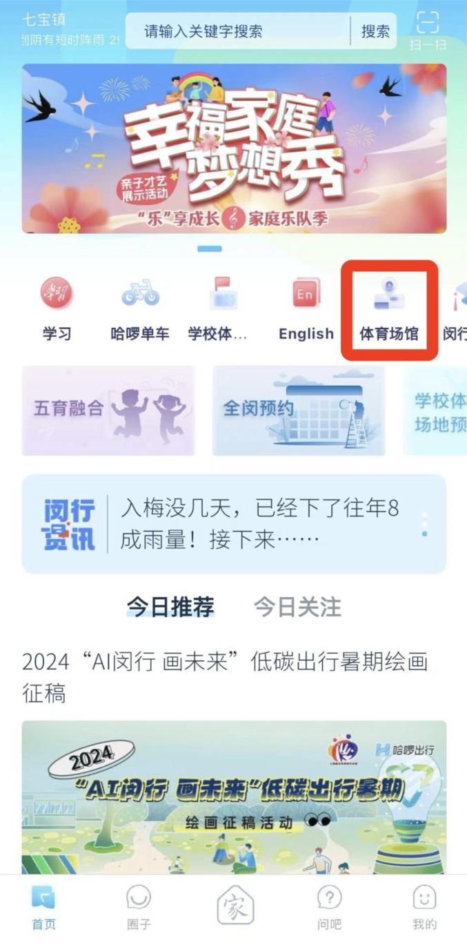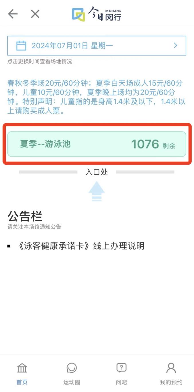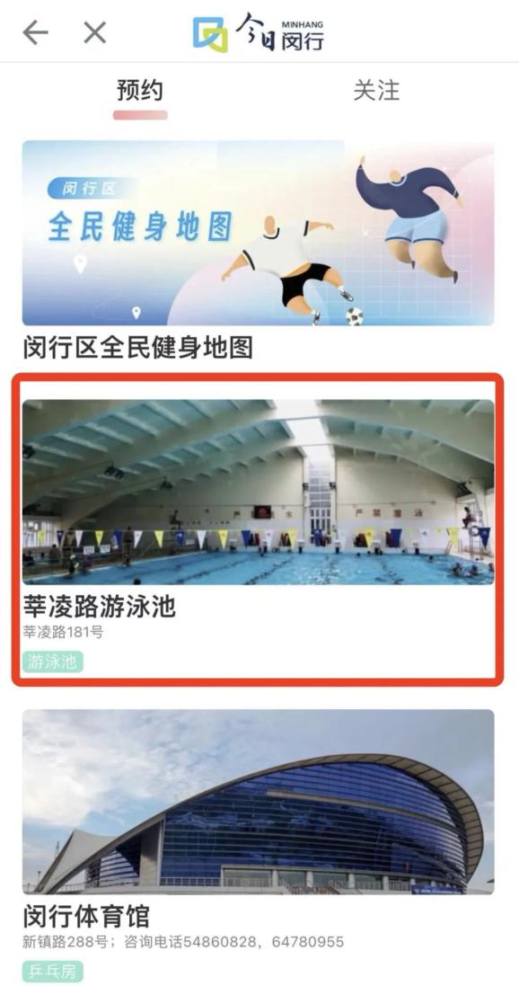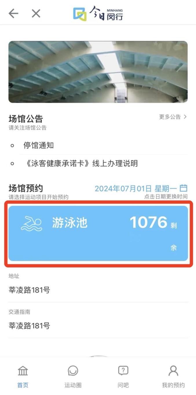 小贴士:由于场次数有限,为了尽可能保持市民的游泳体验,进入莘凌路游泳池前必须使用“今日闵行”客户端“体育场预约”功能。具体操作如下。