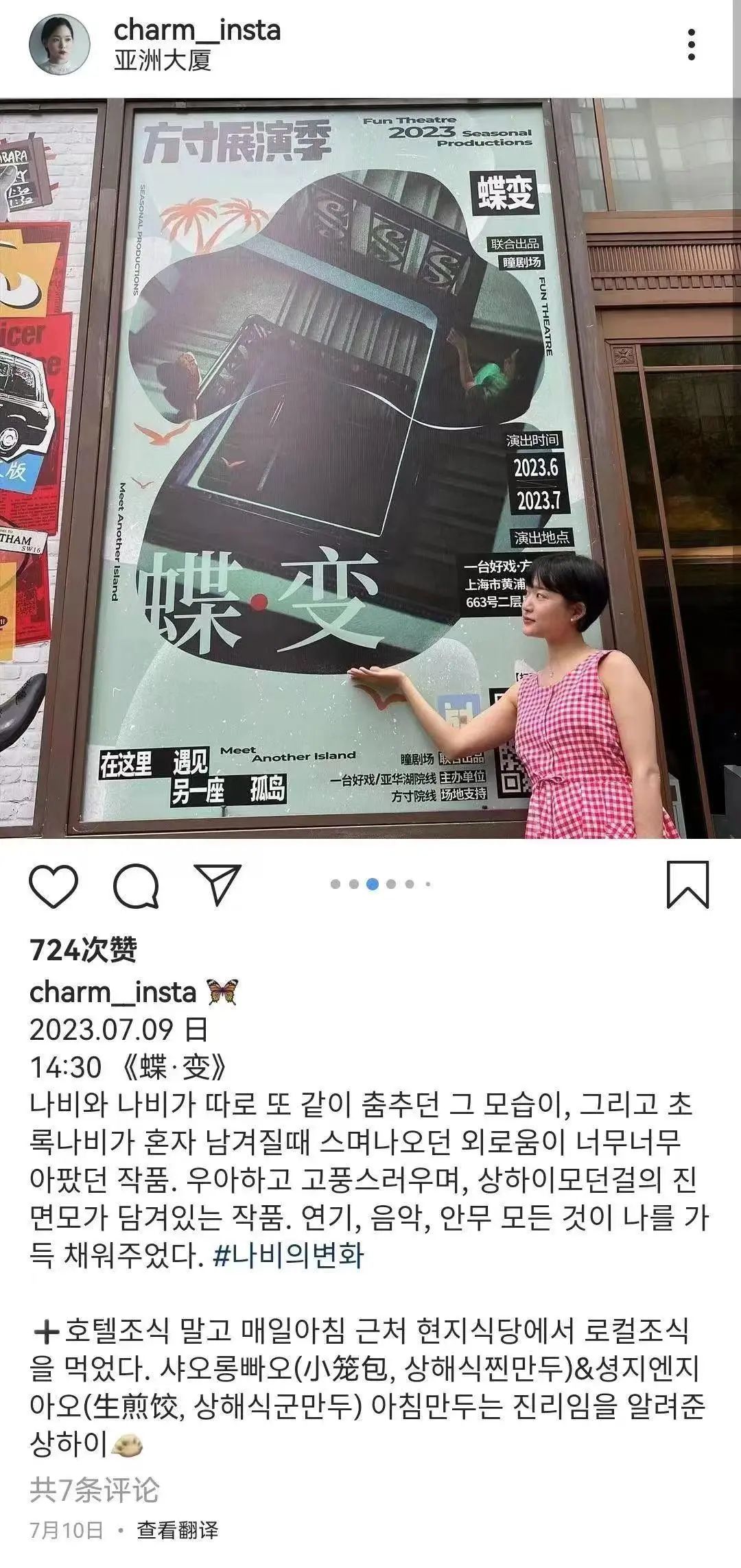 虽然没有完全理解剧情所表达的时代背景,但林赞玟还是被《蝴蝶变》感动了,甚至因为哭得太厉害,收到了旁边观众递来的纸巾。同一天,她在社交平台上发了两篇文章,表达对蝴蝶变化的热爱。