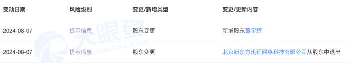 天眼查App显示,近日,与辉同行(北京)科技有限公司发生工商变更,原全资股东北京新东方迅程网络科技有限公司撤出,新董宇辉为股东,全资持股。与辉同行(北京)科技有限公司成立于2023年12月,由法定代表人、执行董事、主管董宇辉注册资本1000万元。(锦观新闻)