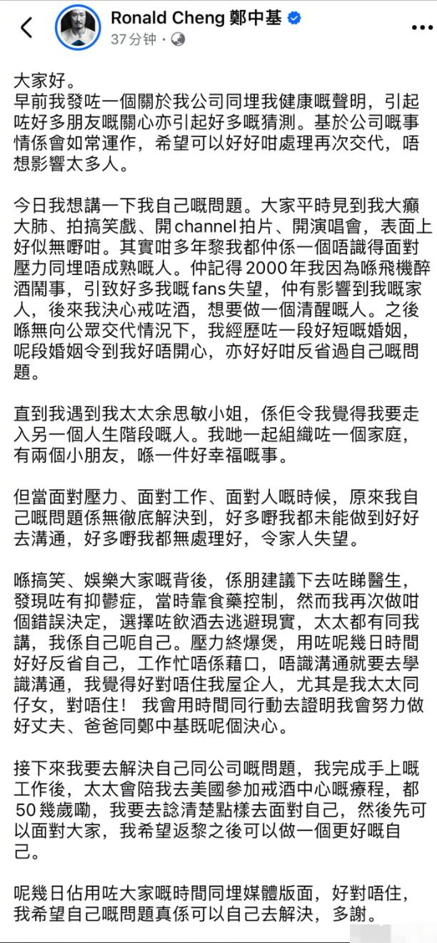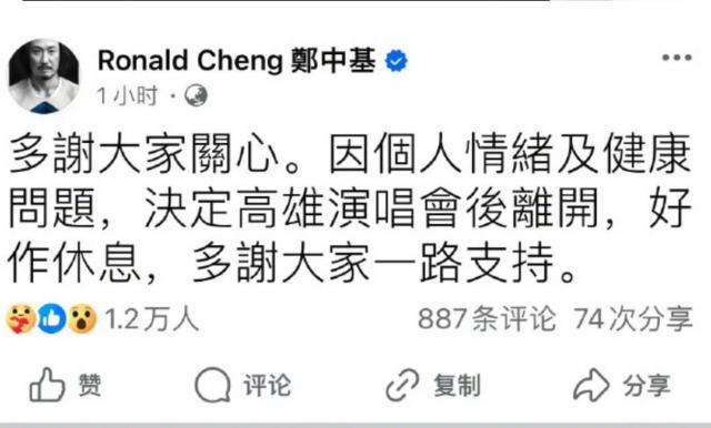 最近一场演唱会之后,香港歌手郑中基突然在社交平台上宣布退出演艺圈。