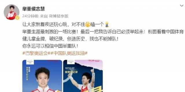 然而,夺金后,侯志慧也在社交媒体上向许多网民道歉。侯志慧发消息说,让大家熬夜玩心跳,对不起。她还直言,这绝对是她举重生涯中最刺激的比赛。她告诉自己,最后一个一定要举起来,因为她不能掉队,因为她看着中国体育运动员拿到金牌,打破纪录,创造历史。最后,侯志慧霸气地说:“你可以永远相信中国举重队!”