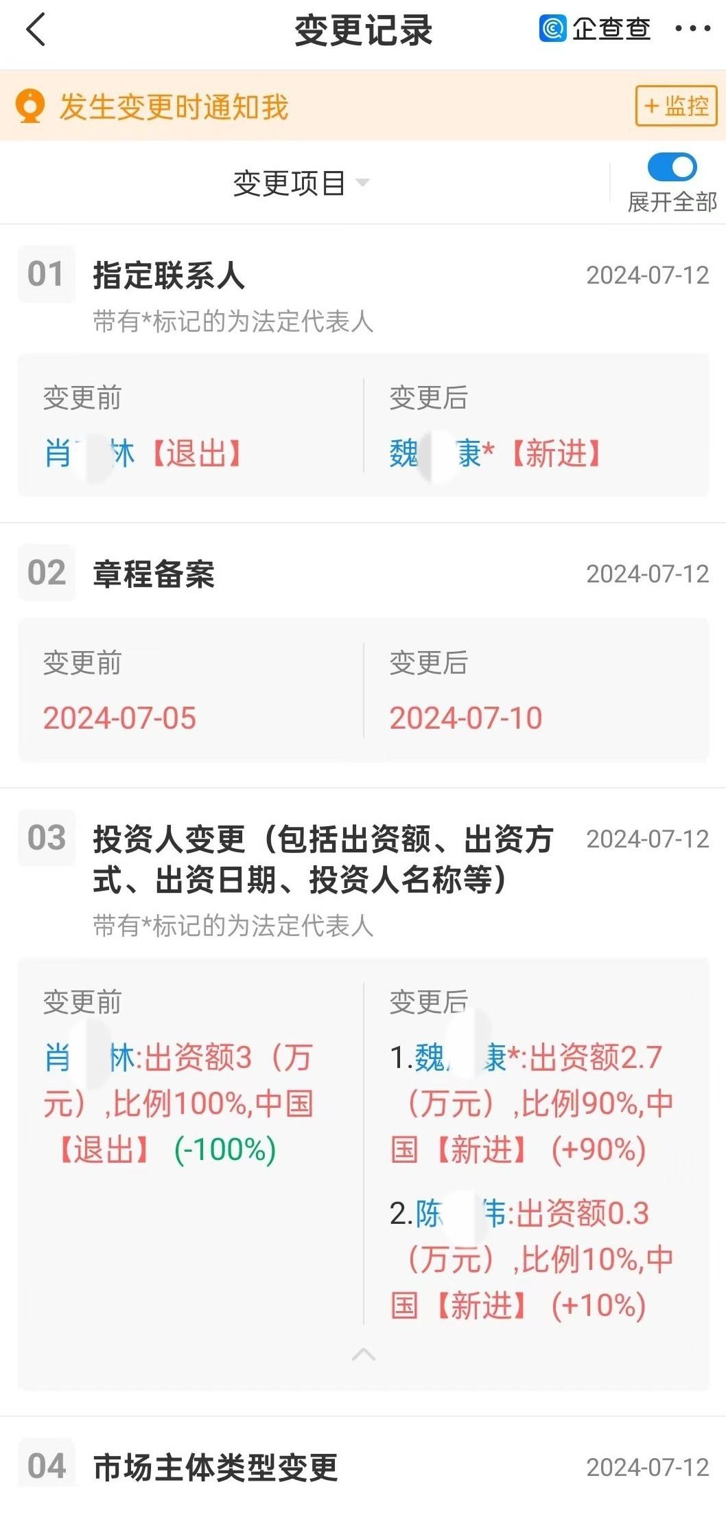 根据该公司的变更记录,今年7月10日,肖某林的出资额从200万元减少到3万元,公司的注册资本也从200万元改为3万元。7月12日,肖某林撤出执行董事、总经理职务,公司法定代表人从肖某林调整为魏某康。