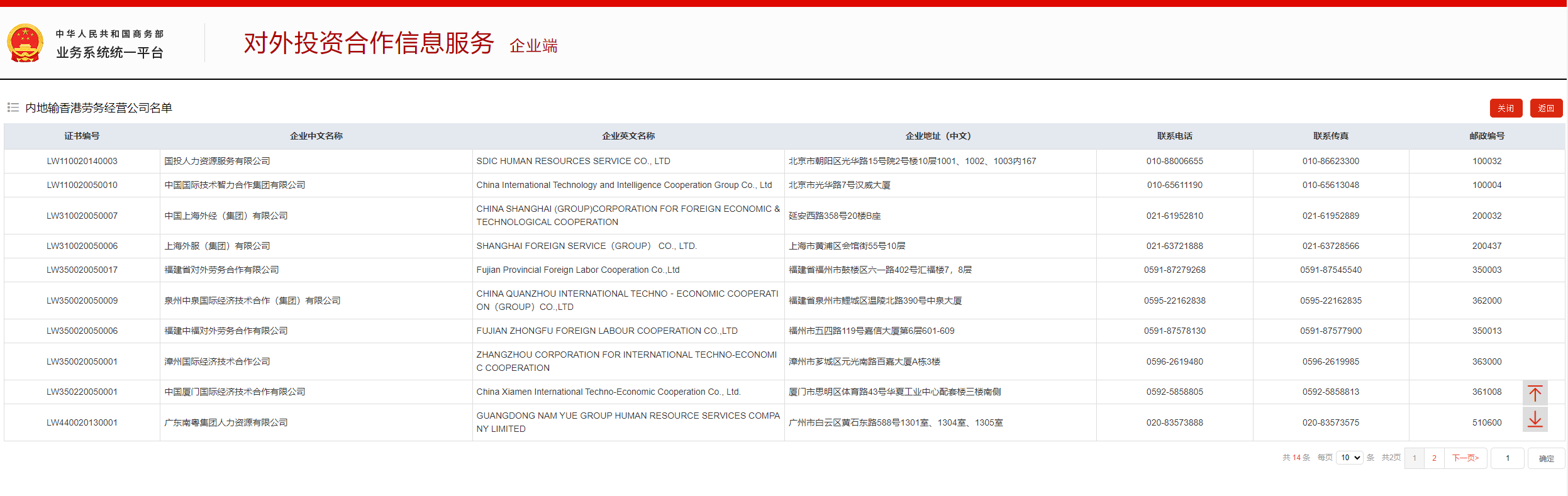 目前,内地有14家内地输香港劳务经营公司在商务部备案。