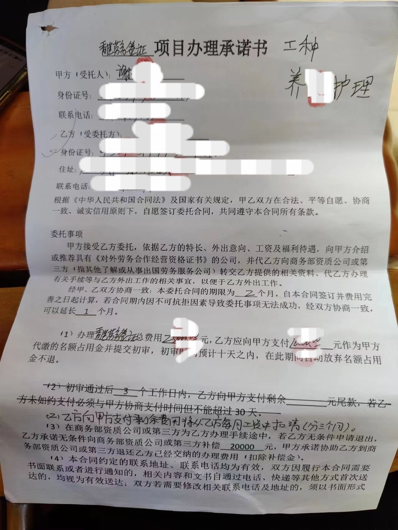 李春兰仍然期待在香港工作。今年年初,她通过朋友认识了冯某珍,并在番禺与她见面。“签合同要交一万块钱。当时我只有1000块钱。我只能向我的同事借钱来收取足够的费用。”李春兰说,我以为在香港工作后可以把钱赚回来,没想到最后不仅没有成功,还丢了钱。