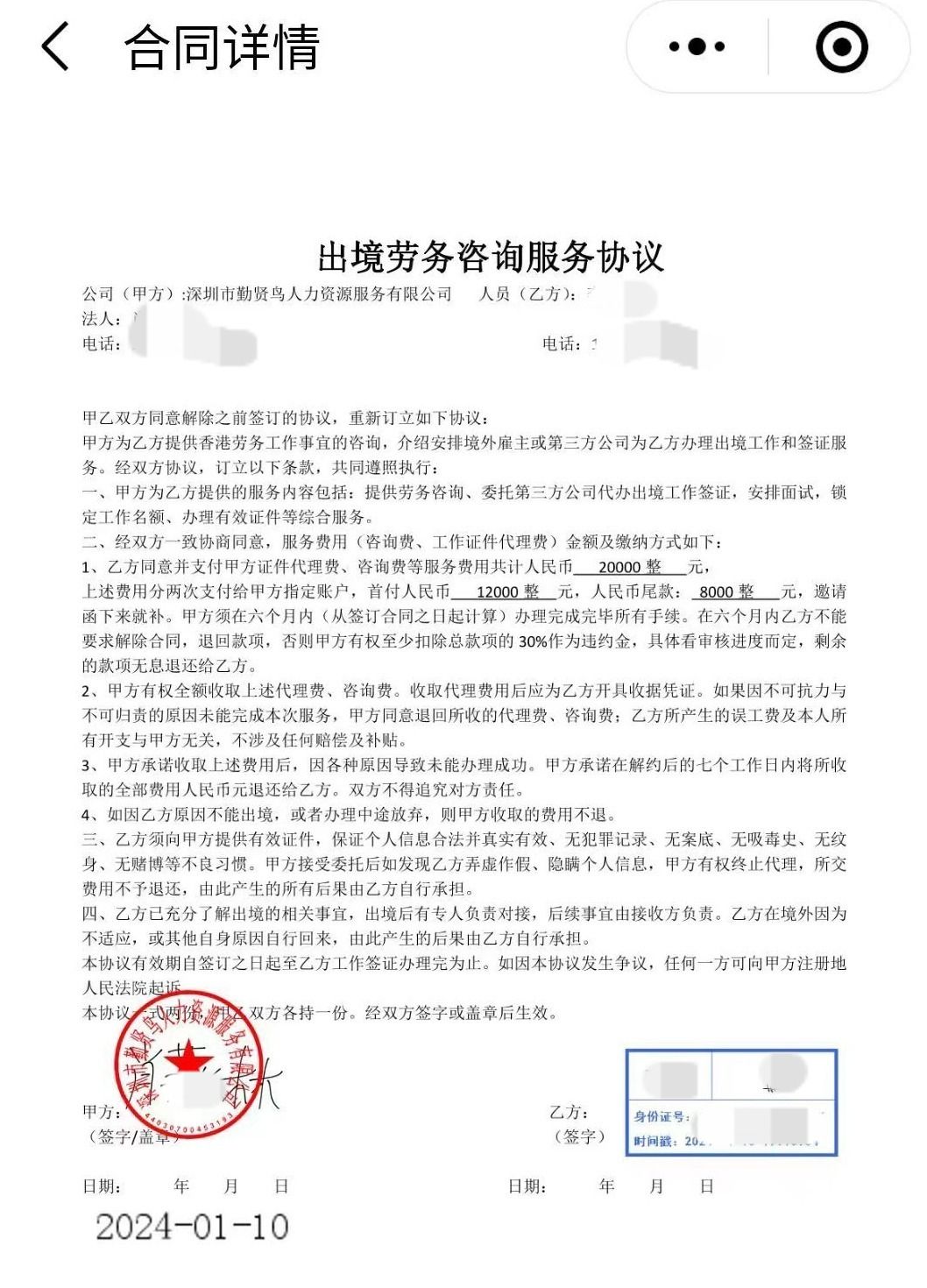 读特新闻记者近日致电深圳市勤贤鸟人力资源服务有限公司,肖某林接电话。肖某林说,他现在不在香港工作,公司已经转让了。肖某林说,他把钱转给了珠海一家公司的负责人莫某英,因为他没有退还代理费。“我们把它交给了他在香港工作的业务。他联系了香港雇主,比如签证。”