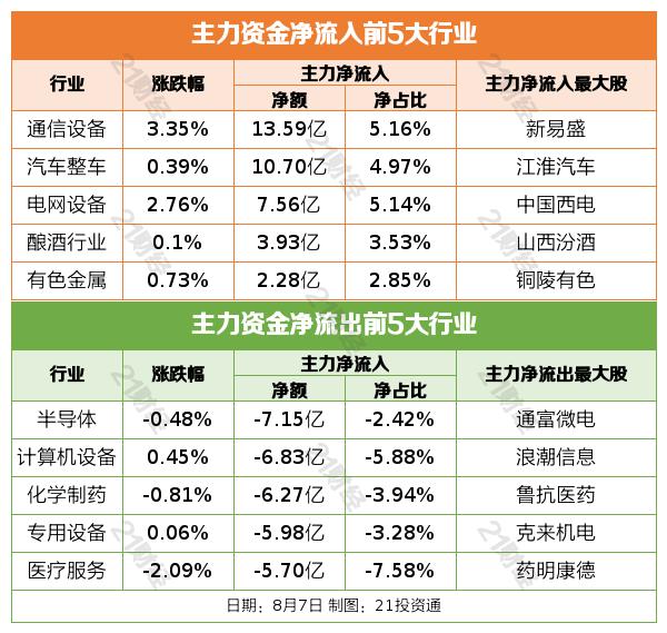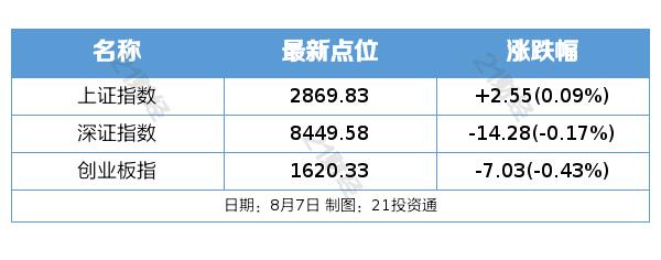 8 月 7 日本,市场全天波动分化,上证指数相对较强。上证指数在收盘时上涨 深成指下跌0.09% 创业板指跌0.17% 0.43%。总的来说,个股跌幅较大,涨幅较小,整个市场超过 2800 只有股票下跌。沪深股市成交额 5920 与前一个交易日相比,亿元缩量 622 亿元,再次跌破 6000 亿元。板块方面,通信设备、商业航天、电网设备、电力等板块涨幅居前,CRO、猪肉、网约车、旅游等板块跌幅居前。