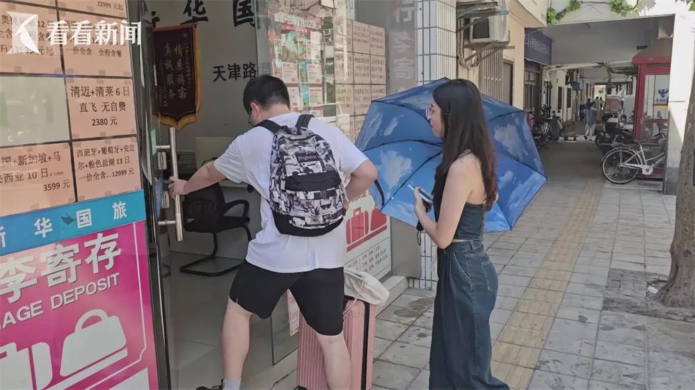 记者在南京东路地铁站遇到了两位江西游客。他们在现场等了很久,储物柜还是满的。后来,他们不得不出去碰碰运气。在40度的烈日下,他们拖着行李走了六七百米后,终于找到了一家提供寄存服务的路边店。25元一天,可以存放到晚上10点。