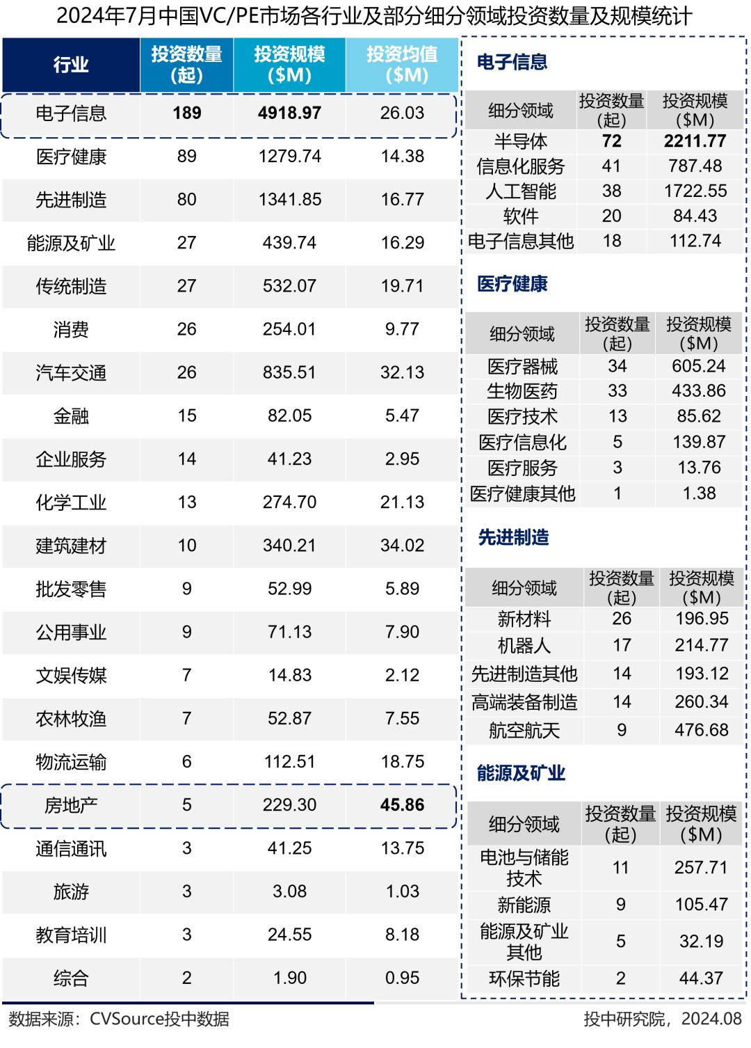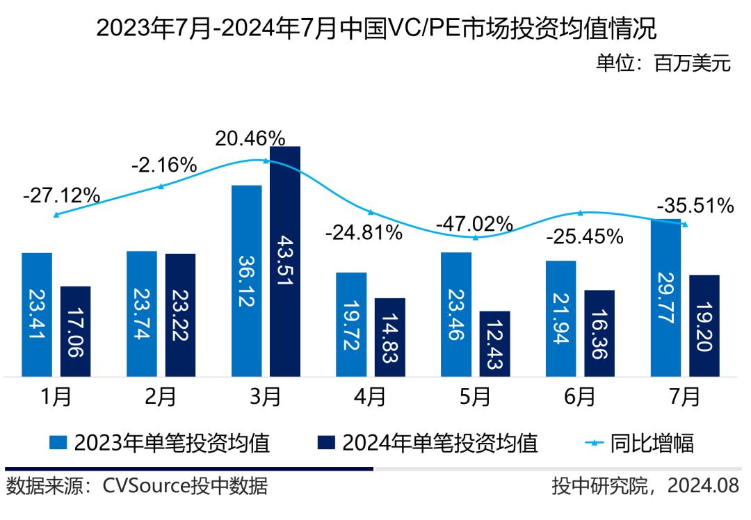 2024年7月,中国VC/PE市场A轮融资额持续领先,涉及交易。234起,市场份额超过40%,VC阶段交易量占80%,投资机构聚集在一起投资早,投资小。