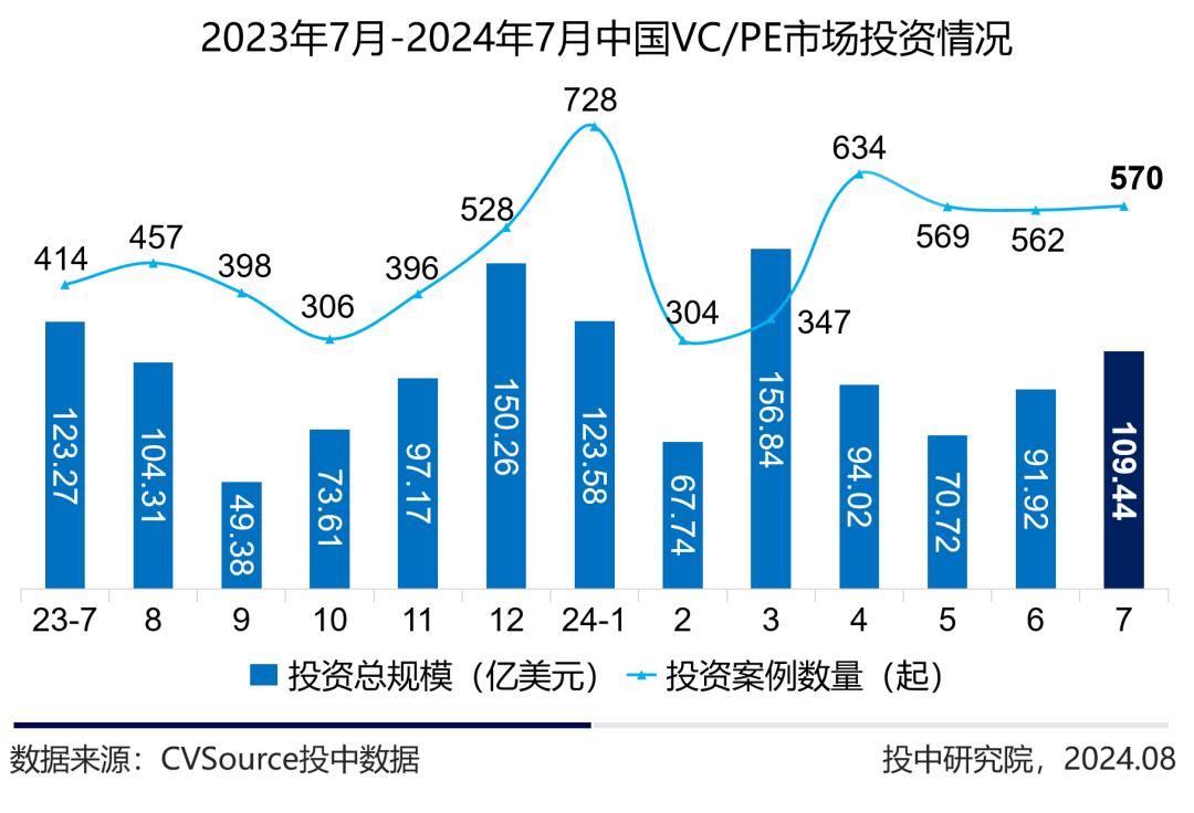 2024年7月,投资案例数量570起,环比几乎持平,同比上升。37.68%;投资总额109.44亿美金,环比上升19.06%,同比减少11.22%。在过去的三个月里,案件数量稳定起伏,规模逐渐上升。