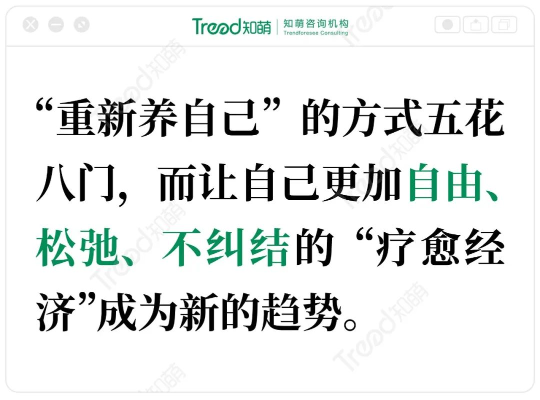 知萌的趋势调查发现,2024年上半年,客户最看重的三大感受是:放松和减压、健康和身心疗愈、淘宝在线聊天、聊天树洞标签产品销量可观。对于小红书来说,心理治愈的话题已经有3.8亿的讨论,55.5%的消费者表示正在实践“重新养活自己”。如何养?不仅要养健康,还要“养心”,享受小时候贪吃却没吃过的美食,看一场“有点贵”的音乐会;买一束“没用”的花,学习一种“浪费时间”的乐器。...再一次养育自己的方式多种多样,而让自己更自由、更放松、更不纠结的“治愈经济”则成为新的趋势。