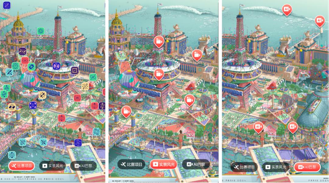 借助腾讯混元大模型,央视体育推出了AI巴黎奥运海报H5。这个H5包括AI巴黎漫游、AI巴黎秀场和探宝巴黎,融合了成千上万的角色和无数的法国代表元素。它还巧妙地将29个奥运项目和18个残奥项目融入到图案和建筑中。观众不但能看到动感的奥运海报,即时的巴黎现场,还能解锁专属的个人奥运海报,让用户身临其境。