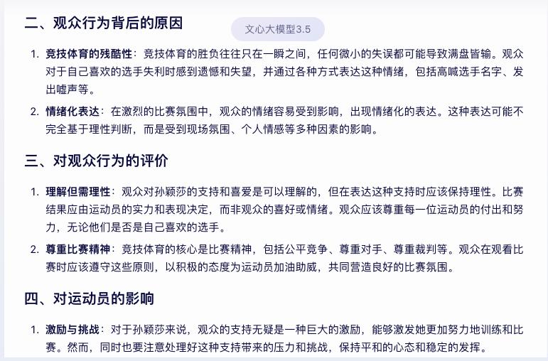 文心一言:文心一言主要分析了部分观众行为的原因和对运动员的影响。分析比较全面,但是车轮话比较多,比其他两个AI语言模型的“AI味道”更强。