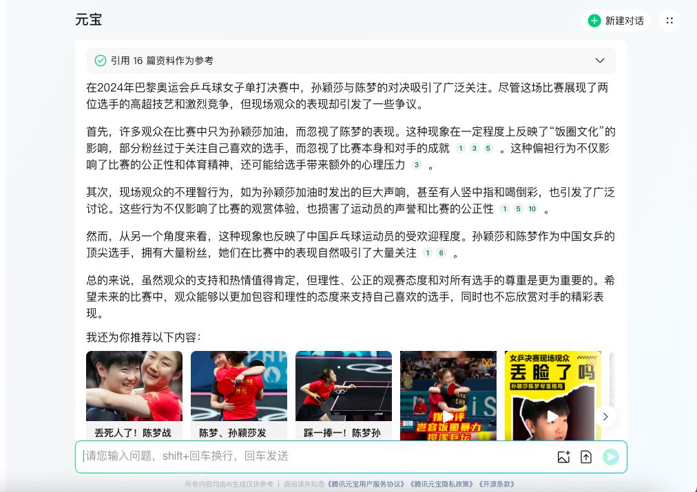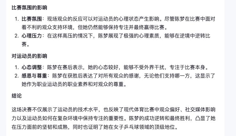 AI大模型工厂进行了实践评估。以最近奥运热点事件“孙颖莎在女乒决赛中对阵陈梦,现场很多观众只为孙颖莎加油”为问题,看看AI的信息整理和分析能力能否成为合格的“奥运会”。