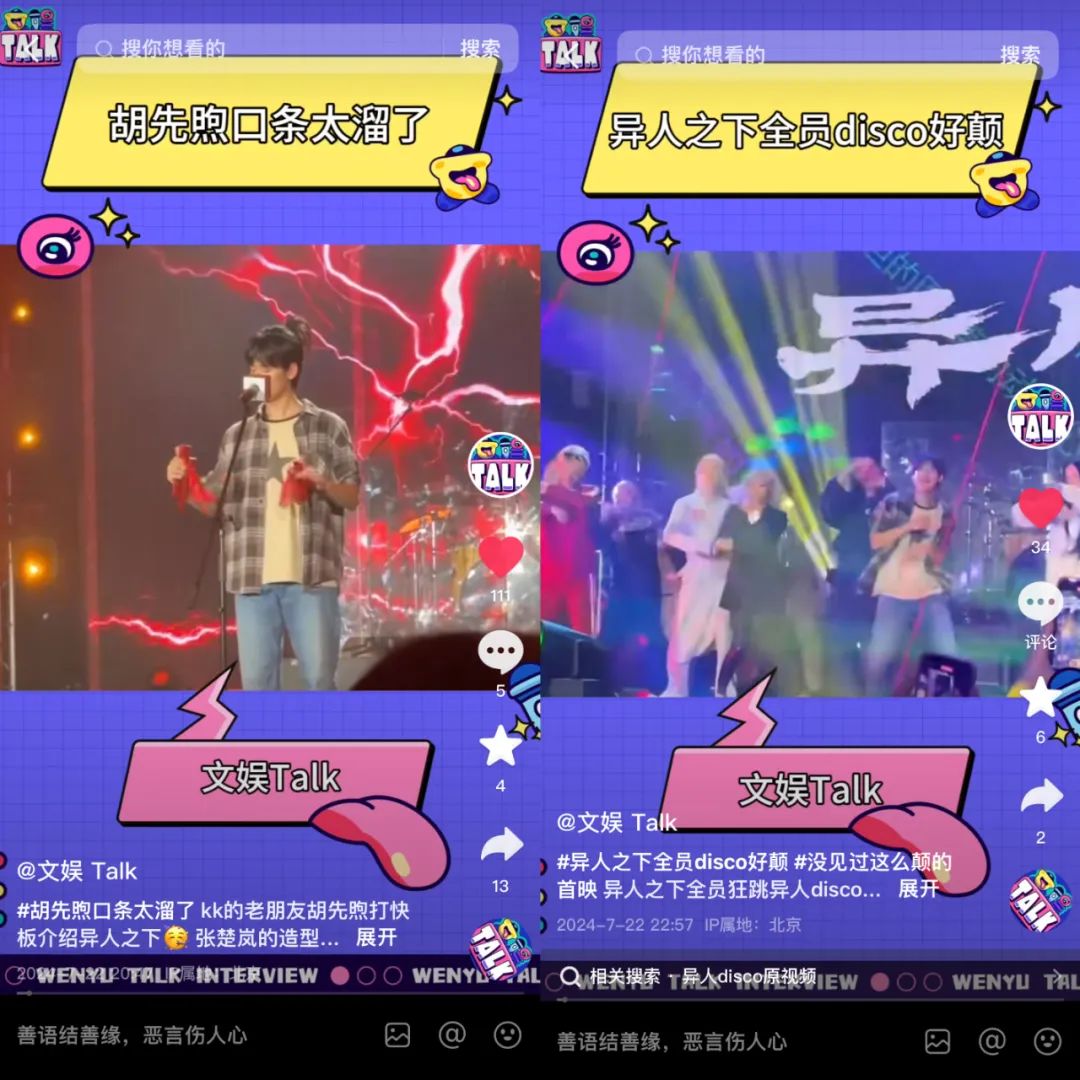 歌舞观众的不仅仅是“负负得正”。不久前,由乌尔善执导的电影《异人之下》首映式,在电影上映后,送上了“异人之夏”联欢会。选择在夏天赶上LIVEHOUSE的趋势。除了常规的电影音乐和歌曲,还安排男主角穿上戏服,根据角色设定分师傅表演才艺,然后给乌尔善唱一首歌。此后,长沙、成都等多个地方的路演更是将这种方式进行到底。