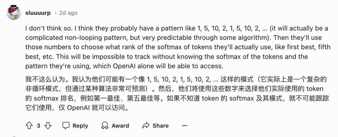 Reddit网友补充说,这是一个从随机到刻意的过程,在限制语境下。想象一下,AI在写作时悄悄地抛出了一枚看不见的硬币。对于我们人类来说,这枚硬币的正反面是完全随机的。但是对于OpenAI来说,这枚硬币的每一次翻转都代表着一个规律,形成了一个只能破解的密码。