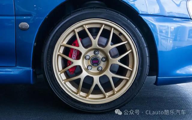 22B 配置的金色 17x8.5 英尺锻造铝合金 BBS 轮毂比新款 STI 深灰色多辐轮毂直径小,整整 50毫米,但是它仍然装载着前四个活塞卡钳和 294mm 前通风盘,后两个活塞钳和 290mm 后通风盘。