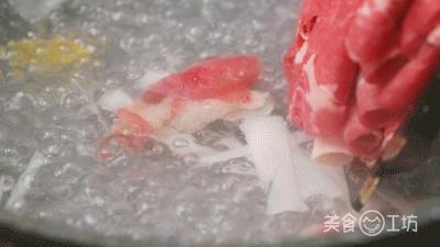 1. 在冷水锅中加入葱段、姜片,烧开后加入肥牛卷,倒入 1 勺米酒,煮熟后捞出。
