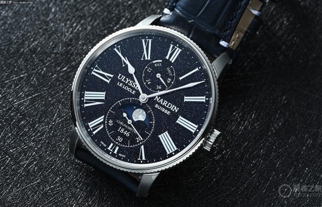 手表评价:近几年来,雅典表采用砂金石材料为我们呈现了许多星空盘面设计作品,无论是 Freak S,Freak X,或是新一代 Blast 月之狂想,以及将砂金石玩出花样,与珍珠贝母相结合。 39 mm DIVER,它们都表现出特别出色的视觉效果。在去年 10 月份,雅典再次推出了图中这款开拓者砂金石月相手表,将砂金石作为漫天繁星,与月相功能相匹配,进一步放大了手表的优雅美感。表径尺寸 42 mm,与一些偏精致的传统正装手表相比,它无疑会更显大气,同时大也意味着,手表能在盘面上更有表现力。在蓝色砂金石盘面上,我们可以看到雅典普遍选择了金属碎渣较多的砂金石原料,这样最终的成品在光照下会产生更加耀眼的砂金效应,12 驱动存储显示点钟位置,6。 在点钟位置设置小秒盘,还延续了梨形指针、罗马时标等航海表标志元素。而 6 点位的月相功能,雅典还以现实主义的风格美感,配以梦幻般的砂金石星空盘面。UN-119 自动化机芯,具有优良的抛光装饰和硅材料性能设备,全链条可提供 60 小时动储。表带配有深蓝色皮革表带。