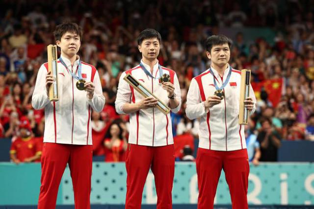▲巴黎奥运会乒乓球男团金牌赛,中国 3-0 瑞典。王楚钦(右)、马龙(中)、樊振东夺冠。