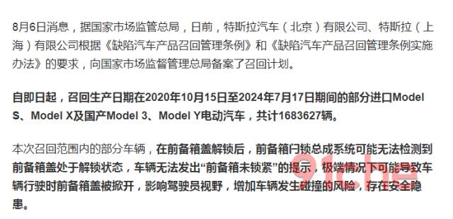 与此同时,特斯拉宣布召回生产日期。 2020 年 10 月 15 日 ~2024 年 7 月 17 日间部分进口 Model S 和 Model X,以及国产的 Model 3 和 Model Y,共计 1,683,627 辆。到目前为止,这是特斯拉在中国最大的一次召回,涉及到其大部分车型。