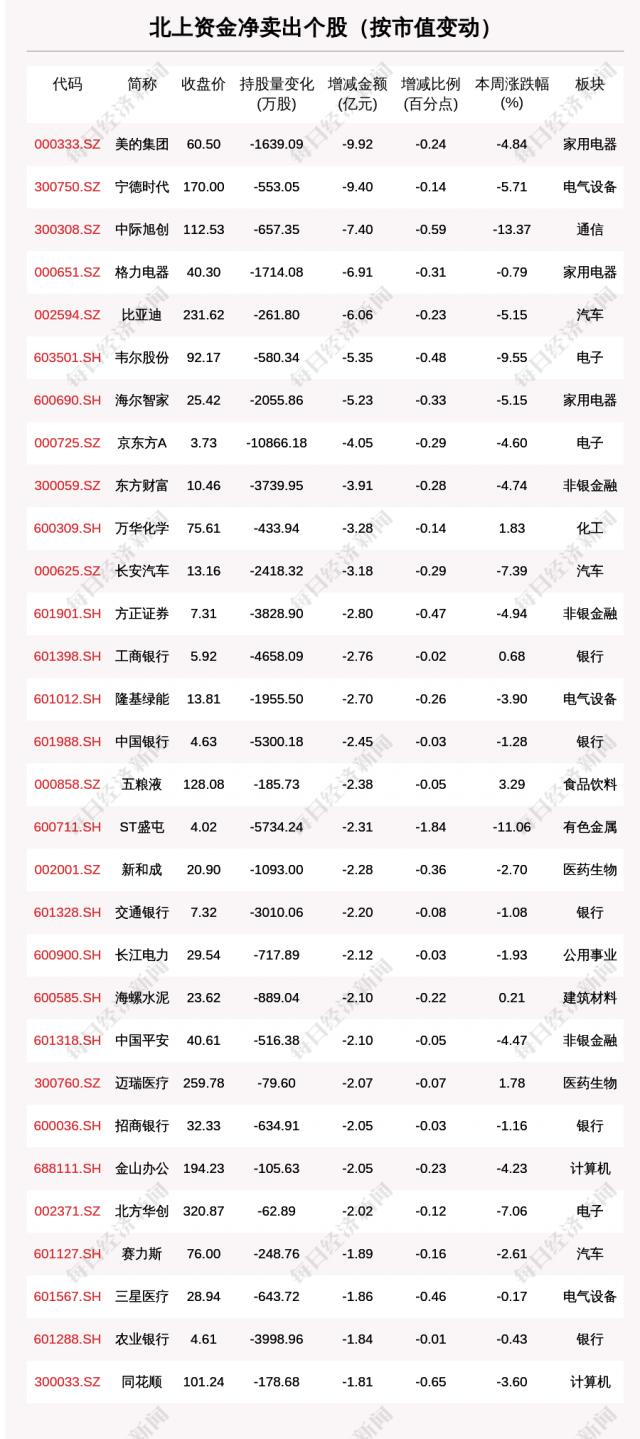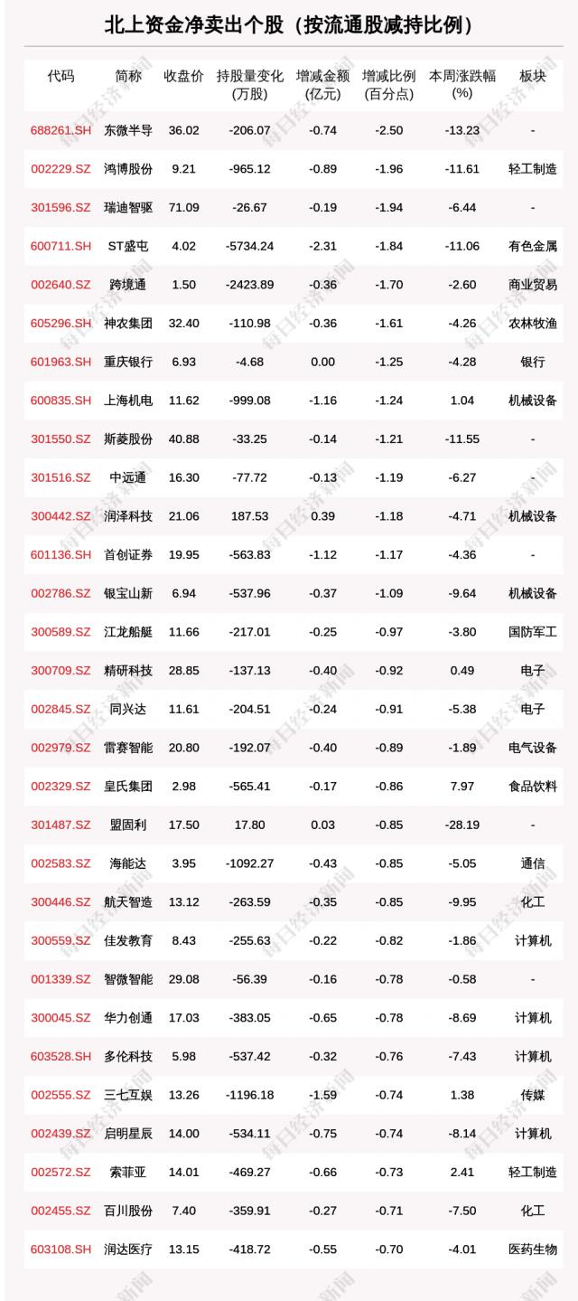 本周北上资金净卖出个股共有股份。 1,592 只是,北上资金减持比例超过 1% 的有 1,437 只。东微半导(688261.SH,收盘价:36.02 人民币)减持比例最为明显,最新持股比例 环比下降1.70% 3.32 %。北上资金减持比例较大的其他股票也包括鸿博股份(002229).SZ,收盘价:9.21 元)、瑞迪智驱(301596.SZ,收盘价:71.09 元)、ST 盛屯(600711.SH,收盘价:4.02 元)。