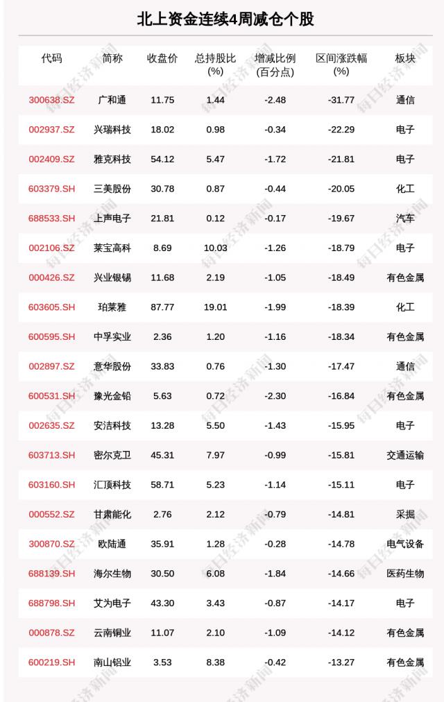 资金在北方持续 4 周售出 149 只有一只股票,其中电子产业的股票最多, 27 只。就市场表现而言,北上资金持续 4 在本周的减持股中,本周的减持股 121 广和通(300638)是唯一股票下跌的股票.SZ,收盘价:11.75 人民币)跌幅最大,跌幅最大 其它跌幅较大的股票包括兴瑞科技(0029377),31.77%.SZ,收盘价:18.02 元)、雅克科技(002409.SZ,收盘价:54.12 元)、三美股份(603379.SH,收盘价:30.78 元)。