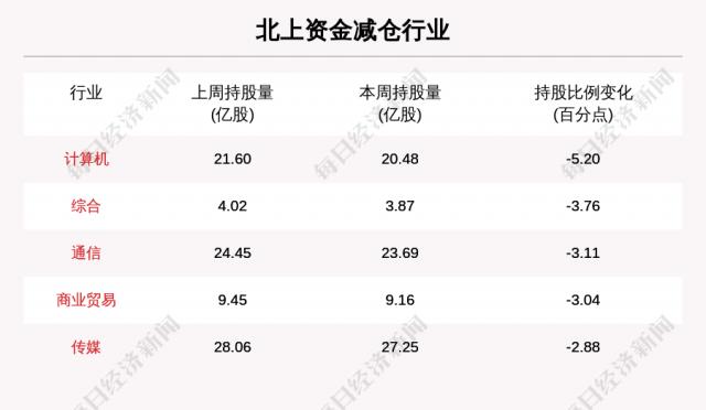 本周北上资金减持行业共有 20 个人。其中,计算机行业减持最为明显,北上资金持股环比下降。 5.20%。其它北上资金减持较多的行业也包括综合、通信、经济贸易。