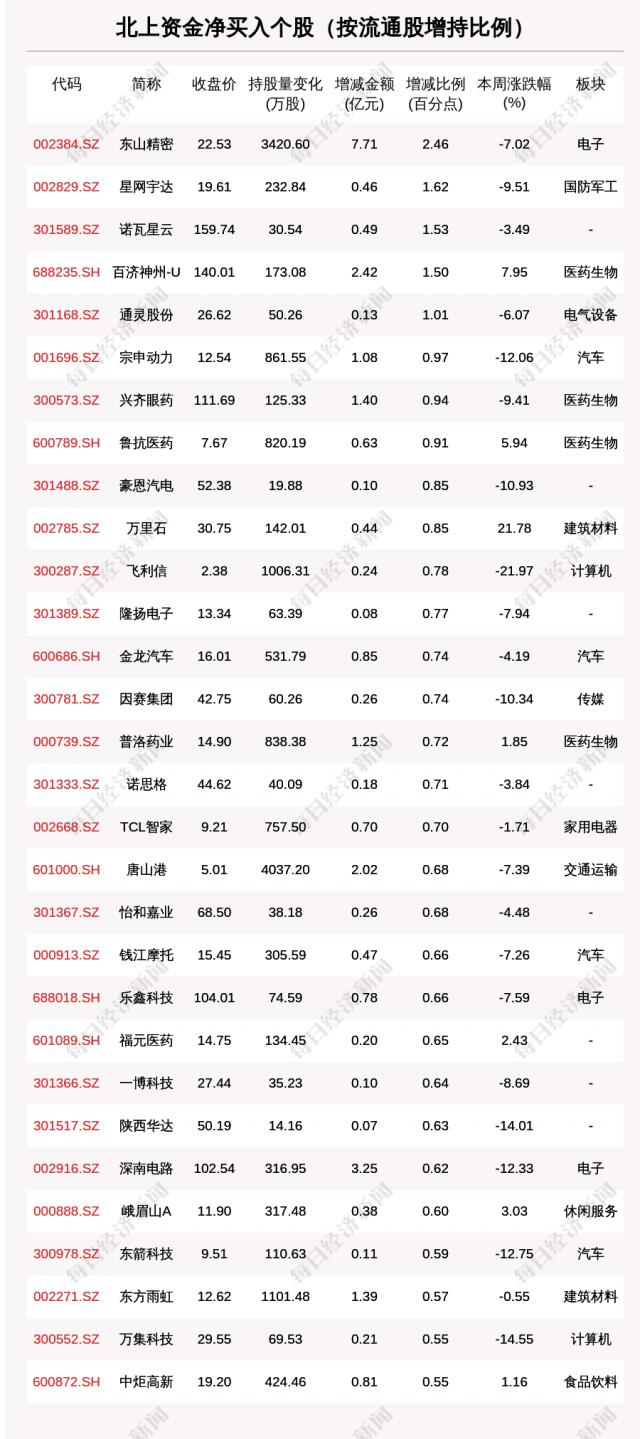 本周北上资金净买入个股共有股份 1,087 只是,北进资金的加仓比例超过了 1% 的有 977 只。东山精密(002384).SZ,收盘价:22.53 人民币)加仓比例最为明显,最新持股比例 环比增长6.95%。 2.79 %。其它北进资金加仓比例较大的股票也包括星网宇达(002829.SZ,收盘价:19.61 元)、诺瓦星云(301589.SZ,收盘价:159.74 元)、百济神州 -U(688235.SH,收盘价:140.01 元)。