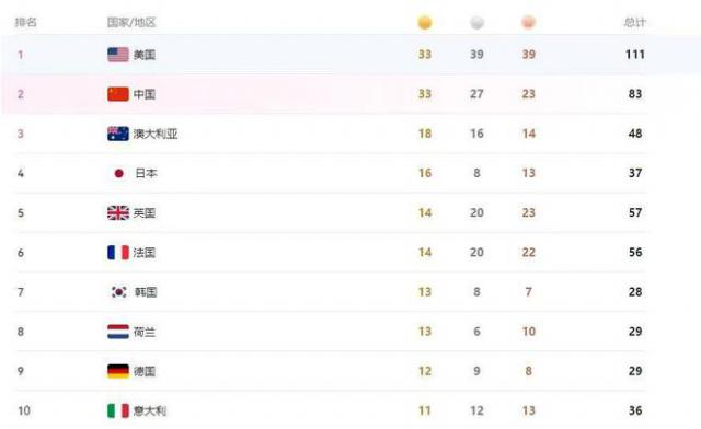 第 1 档美国队和中国队,现在是美国队, 33 金 39 银 39 铜牌总数 111 枚,中国队是 33 金 27 银 23 铜总奖牌数 83 枚。此前,美国队凭借自己在游泳项目上的表现冲到了积分榜的前列,但来到田径项目后,他们获得奖牌的速度仍然保持着强劲的势头。多次完成反超阶段,随后美国队又一次夺金夺银,稳居金牌榜首位置。只是他们的 4*100 大米成绩无效还是超出了外界的预期。