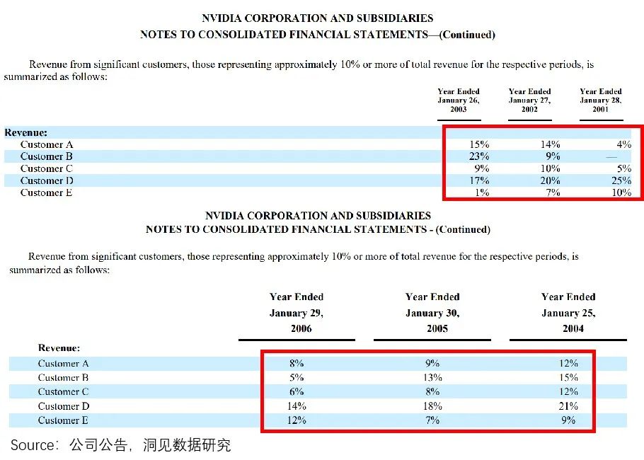 可以看出,英伟达的用户一直都很集中,CR5长期占一半以上。2002年巅峰时期,前五大客户收入占65%,前两大客户占比惊人的40%。当时大金主微软撤单后,英伟达业绩暴跌,股价暴跌90%。