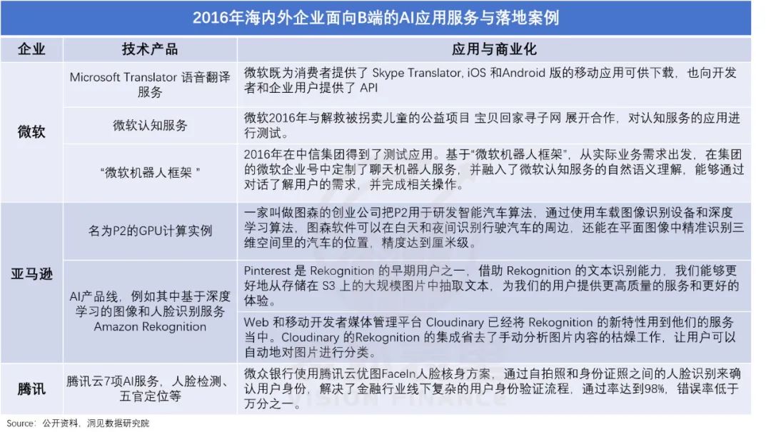 可以看出,各大厂商开始为各行各业的B端客户提供图像识别、认证、检索等一系列基于深度学习的AI服务产品。