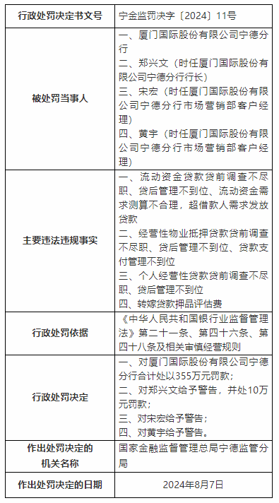 厦门国际宁德分行因信贷管理不到位等4项违规行为被罚款355万元。