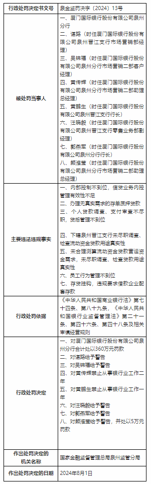 厦门国际银行泉州支行因违规要求贷款公司配套存款等7项违规行为被罚款360万元。