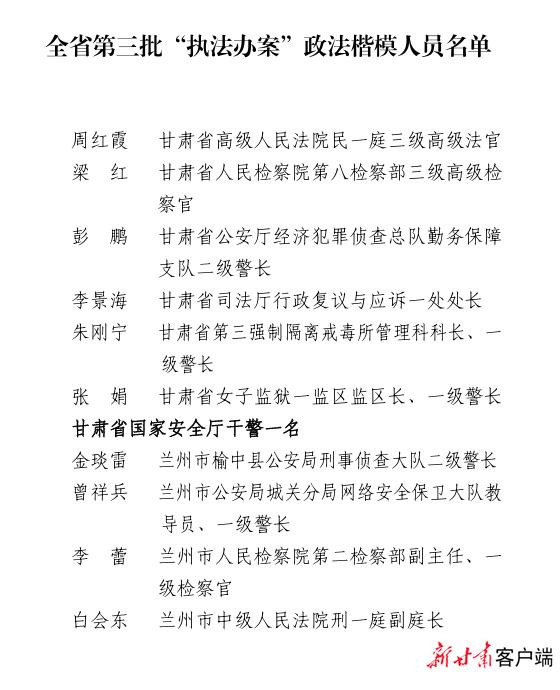 在第三批30名“执法办案”的政法典范中,不仅有坚持司法为民、公正司法的法官和检察官,还有扎根基层、解决人民后顾之忧的普通公安干警;不仅有敢于亮剑、消除恶务尽的人民卫士,还有坚守一线、默默奉献的牢房和戒毒干警。省委政法委呼吁,全省政法制度要以楷模为榜样,积极营造学习楷模、倡导楷模、争当楷模的浓厚氛围,强化使命责任,忠于履行职责,切实肩负起党和人民赋予的职责和使命,在推进甘肃政法工作现代化的新征程上,书写不愧为时代和人民的全新篇章。