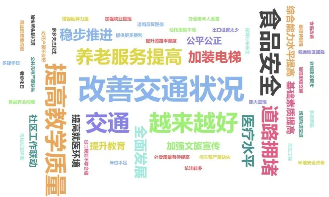 本次调查还通过开放式问题征求了公众对全区质量提升的意见和建议。字云图显示,松江区公民普遍认可和支持全区质量工作,并在“医疗环境”、“养老服务”和“教学水平” “交通状况”等领域直观地表达了质量提升的高度要求和促进提升的方向。