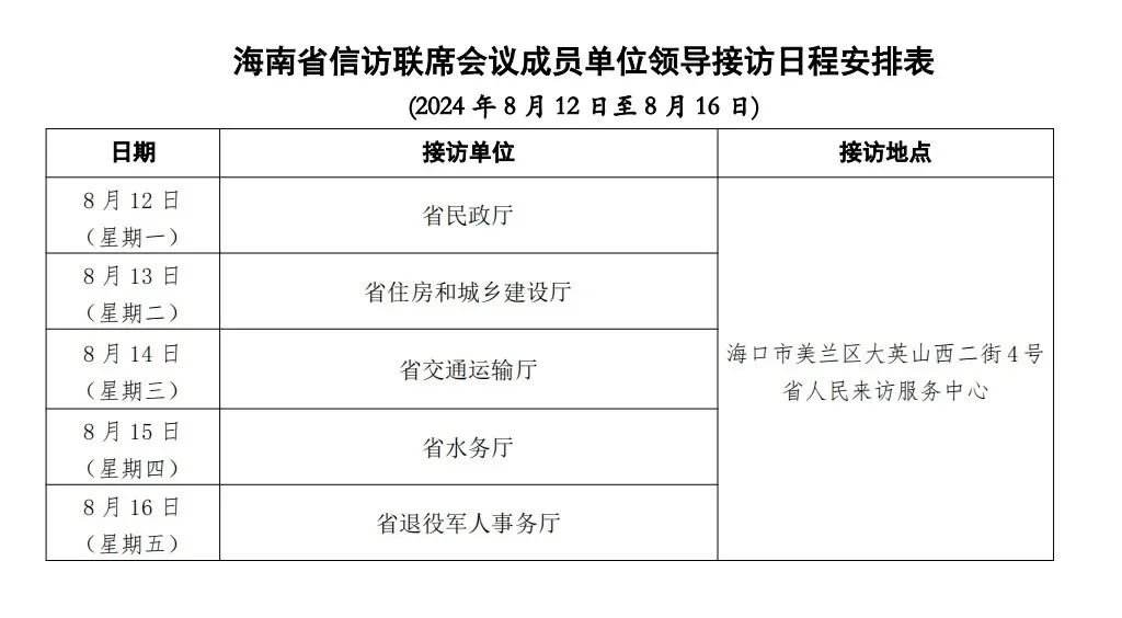 海南省直属单位领导接访日程于8月12日至8月16日公布。详情(来源:南海网)