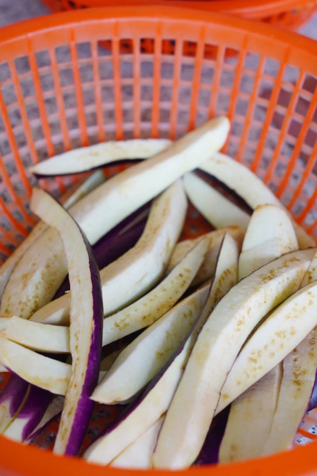 在茄子中加入适量的盐腌制一会儿,用力揉搓,挤出茄子汁。将茄子盛出,晾干至茄子无水分状态。