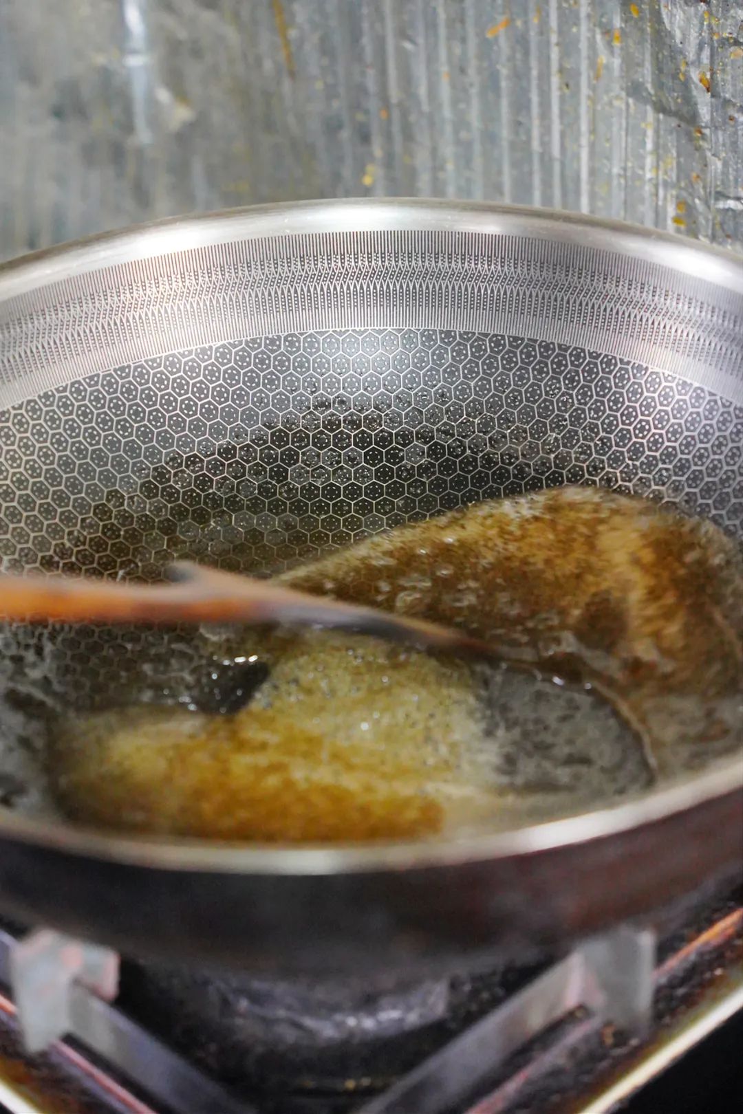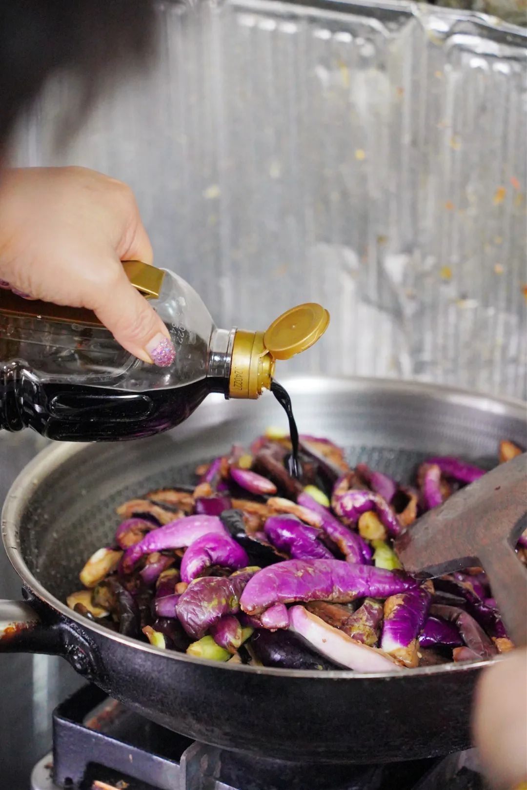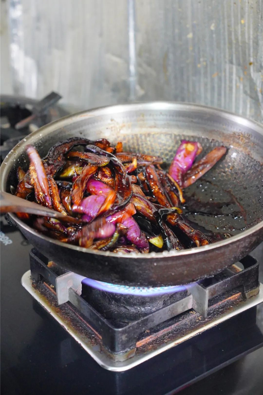 4.将适当的冰糖放入锅中,倒入少量的水,开火加热至冰糖完全融化,然后倒入茄子和适当的酱油,用文火翻炒至茄子着色,水分干燥。