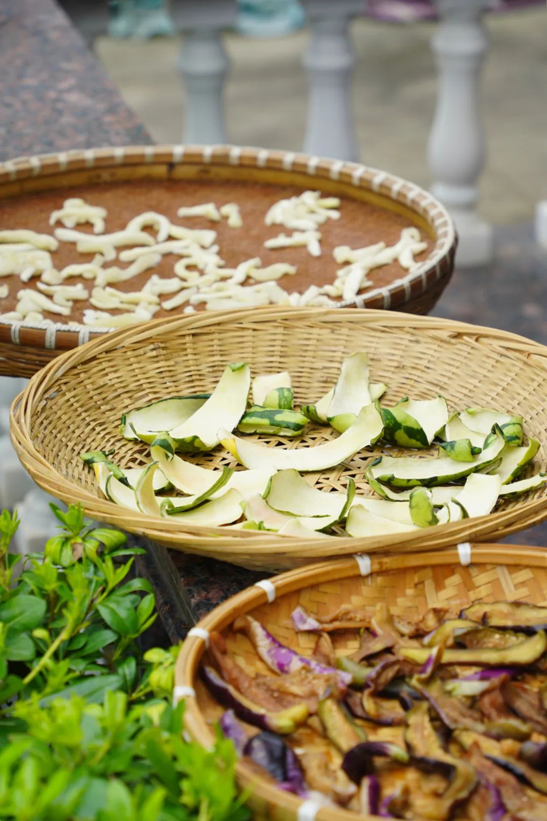 盛茄子,铺在竹编簸箕上,在太阳底下晾干一到两天即可。