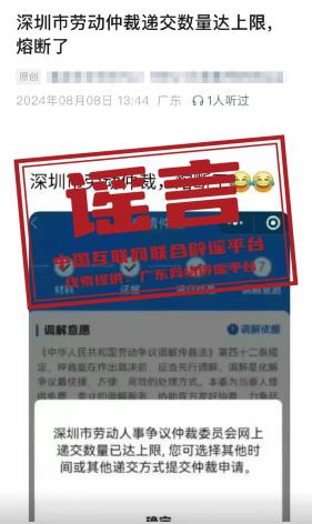 真相:近日,“深圳市劳动仲裁融断”、“深圳市劳动人事争议仲裁委员会网上提交数量达到上限”等消息在多个网络平台传播,引起关注。深圳市人力资源和社会保障局表示,这一消息实属谣言。目前深圳劳动仲裁服务平台没有此类提示,仲裁案件数量没有异常波动,受理和审判工作有序开展。市民可以通过预约(现场)提交、邮寄提交、网上提交三种仲裁申请方式正常获得服务。今年年初系统更新期间,网络上流传的截图系统提示旧图。当前,网上提交功能已经优化,并且没有设置数量限制。(来源:广东省因特网报告中心)