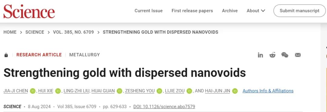 近日,中国科学院金属研究所沈阳材料科学国家研究中心金海军研究人员团队提出,如果细化到100纳米以下,并在材料上弥漫分布,孔洞将在有害材料缺陷中转化为有益的“强化相”。该团队以黄金为模型材料的研究表明,在不损失甚至提高塑性的情况下,增加弥漫纳米孔可以降低材料密度,大大提高其强度。八月九日有关研究结果“Strengthening Gold with Dispersed Nanovoids"Science期刊上出现了问题。