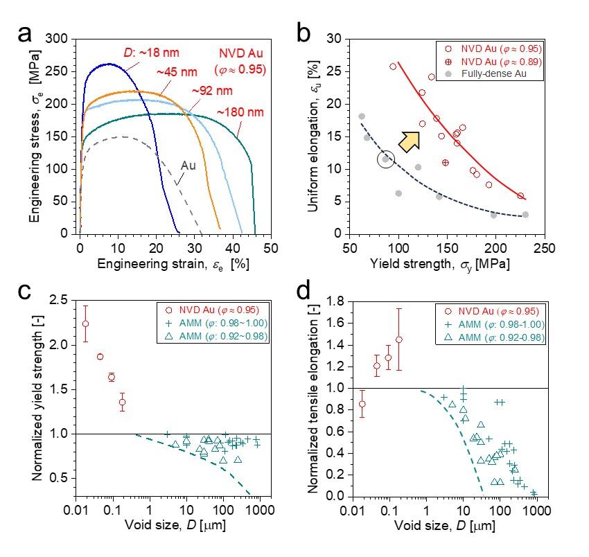 图2 加强金的纳米孔扩散(NVD Au)力学行为:(a) NVD有不同的孔径 全密参比样品Au及拉伸曲线;(b)随着屈服强度的变化,两种样品的匀称延伸率;(c)屈服强度和(d)对称延伸率随孔径变化规律。AMM: 添加剂制造金属材料。以相应的全致密样品数据为基础,对屈服强度和匀称延伸率进行归一化。