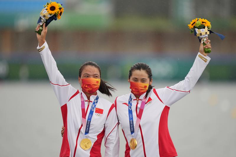 徐诗晓(左)/孙梦雅于2021年8月7日在颁奖典礼上举行。同一天,中国选手徐诗晓/孙梦雅在东京奥运会皮划艇静水女子500米双划艇决赛中获得冠军。新华社记者 费茂华 摄