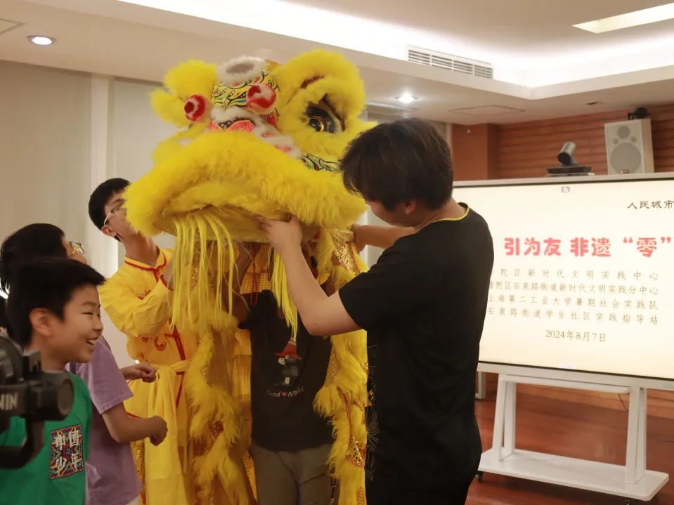 近日,石泉路街道新时代文明实践分中心与学生社区实践指导站、上海第二工业大学暑期社会实践队联合开展了“龙狮”,以进一步激发学生对传统艺术的热情,促进非物质遗产的传承和发展。 “零距离”非遗活动。